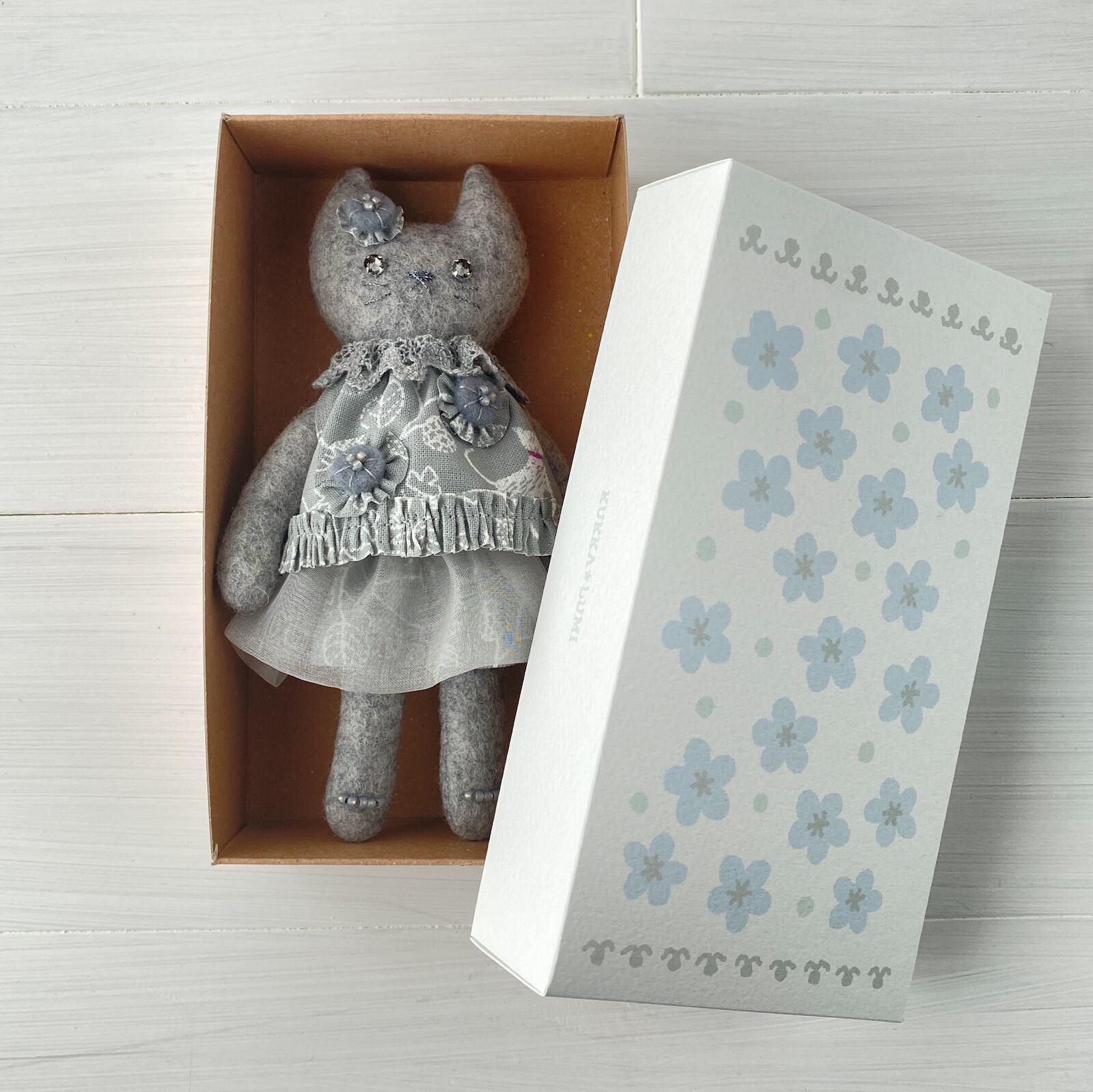 ブルーグレーの花模様の紙箱入。